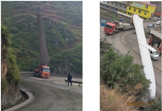 银河风电四格项目经理介绍,为解决山区多弯道路的长叶片运输难题,早在项目动工之前,公司的运输技术团队就先对风电场进场道路进行了详细路勘,对每一个弯道,每一处桥梁,乃至路上的每一根架空线路都进行了测量与计算。路勘结果表明,如采用常规运输技术,为满足叶片运输必须的道路转弯半径,项目在道路改造及拆迁征地等方面将会产生巨大费用。对此,公司技术团队在进行深入研究之后,创造性地设计出一套对运输车辆的技术改造方案。该方案通过在叶片运输车辆上加装特制的液压传动机构,并经由控制系统实时控制,在过弯时根据情况使叶片根部支架沿垂直或水平方向进行抬升或偏转运动,从而大大降低叶片运输对于道路转弯半径的要求。该技术的成功应用,不仅解决了四格风场的叶片运输难题,降低了项目运输成本,而且为今后国内所有山区风场的长叶片运输提供了宝贵的可借鉴经验。