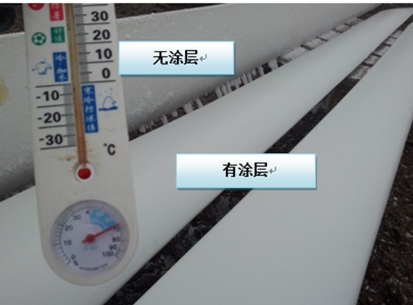 其中,“抗凝冻”项目组通过与德国著名材料研究机构合作,经过近两年时间的反复试验,成功开发出的新型“超疏水性”叶片抗凝冻涂层技术,已经经过了上一个冬季在四格现场的小叶片对比试验,结果显示,该涂层较普通涂层具有显著的抗凝冻效果。