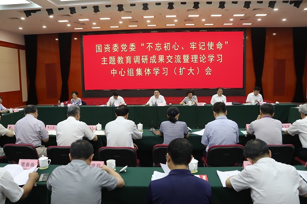 7月30日,国资委党委召开“不忘初心、牢记使命”主题教育调研成果交流暨理论学习中心组集体学习(扩大)会。国资委党委书记、主任郝鹏主持并带头交流调研成果。他强调,要深入学习贯彻习近平新时代中国特色社会主义思想,贯彻落实习近平总书记关于国资国企改革发展和党的建设重要论述,把学习教育、调查研究、检视问题、整改落实贯穿“不忘初心、牢记使命”主题教育全过程,坚持通过调查研究检视问题、破解难题,切实把调研成果转化为解决问题、推动工作的有效措施和具体行动。国资委党委成员作交流发言,国资委副部长级干部出席,中央第二十一指导组副组长诸葛彩华及有关成员到会指导。